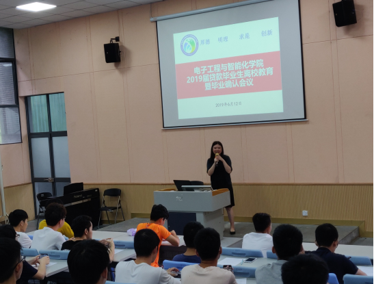 为推进毕业生离校教育工作,增强大学生诚信意识,电子工程与智能化学院面向2019届贷款毕业生于6月12日下午,在8A103开展贷款毕业生诚信教育暨毕业确认会议。会议由电子工程与智能化学院辅导员卢楚韵主持。