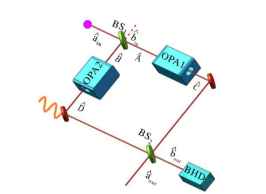 图7 是理论提出的基于光学参量放大的迈克尔逊干涉仪的方案[Acta Physica Sinca,67, 134202 (2018)]。将光学参量放大器引入迈克尔逊干涉仪,使其取代线性干涉仪中的线性分束器,构建基于光学参量放大的迈克尔逊干涉仪。通过光学参量放大器对信号的放大作用,提高干涉仪的信噪比和灵敏度。