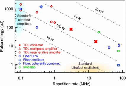 图2. 高峰值功率高重复频率超短脉冲激光器的研究进展。