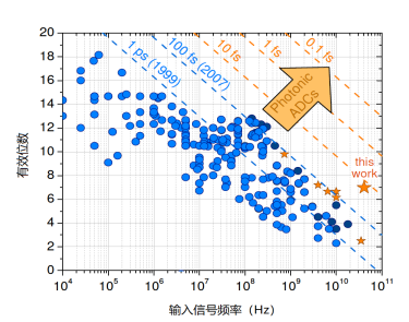 图5. 基于电子学器件(蓝色圆点)和基于光子学器件(橙色五角星)ADC器件性能汇总。