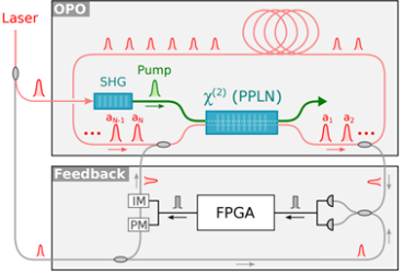 图9 相干伊辛机(CIM)的一种实验装置图. 上半部分为主振荡腔,下半部分为测量-反馈装置。