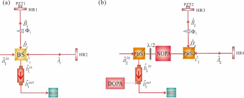 图7 (a)迈克尔逊干涉仪,(b)基于光学参量放大的迈克尔逊干涉仪