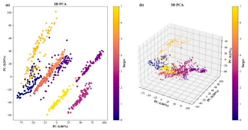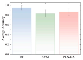 论文二研究结果表明RF模型的平均准确率达到0.9337,明显高于SVM模型的0.8281和PLS-DA模型的0.8646。RF模型在测试集中的灵敏度、特异性和准确率表现优异,并在5折交叉验证和预测集上展示了其可靠性和分类能力。RF模型的微平均AUC高达0.9996,显著超过SVM的0.9761和PLS-DA的0.9847。此外,PCA结果揭示了在分类过程中关键元素及其波长。该研究为快速、准确的钢合金分类提供了一种新颖且有效的方法,对材料科学和工业应用具有重要意义。