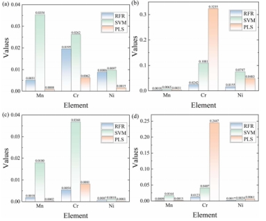 论文一研究结合了OOB-RFR模型和fs-LA-LIBS技术,实现了钢合金样品的定量元素分析。通过优化fs-LA-LIBS数据集中的OOB误差,RFR模型在测试样本中展现出良好的拟合能力和强大的预测能力,尤其在复杂数据环境中,相比SVM和PLS模型表现出更高的准确性和稳定性。对Mn、Cr、Ni元素的训练样本预测结果显示,RMSE不超过0.1471,MRE不超过0.2205,R²不低于0.997564;在测试样本中,RMSE不超过0.0952,MRE不超过0.2879,R²不低于0.936947。因此,该方法为钢合金及其他材料的快速、精准的多元素定量分析提供了新的校准方法。