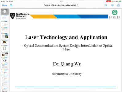 国际学术周于10月13日至27日顺利举行。作为国际学术周的一部分,电智学院光学团队邀请了英国诺森比亚大学副教授吴强博士给2020级光电信息本科生开设了一门8课时的全英文国际课程,主要讲授了“激光应用技术”课程中的光纤光学部分,并于11月1日圆满结束。