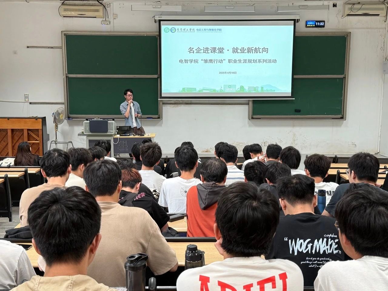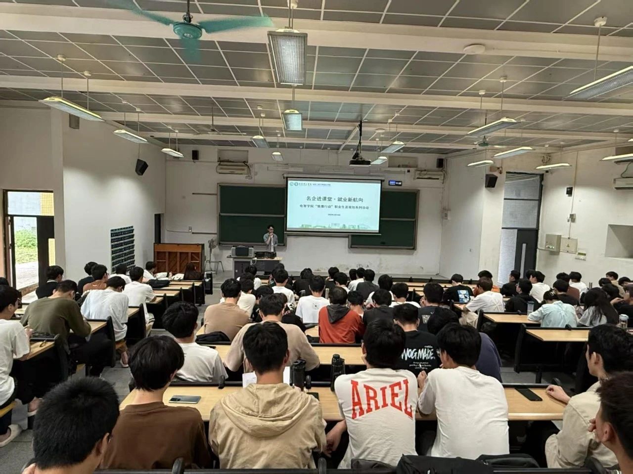 2025年4月18日,“雏鹰行动”职业规划系列活动之“名企进课堂,就业新航向”火热开展,电智学院2022级就业指导课堂上人头攒动,学院实习基地华勤技术、视源股份两家企业进入课堂为同学们带来了精彩的就业指导讲座。华勤技术人力资源经理眭维、招聘主管赵莉、马玟,校友李星梓,视源股份HR王艺霏、校友范乾煊进入就业指导课堂,为学生提供“一站式”求职赋能。