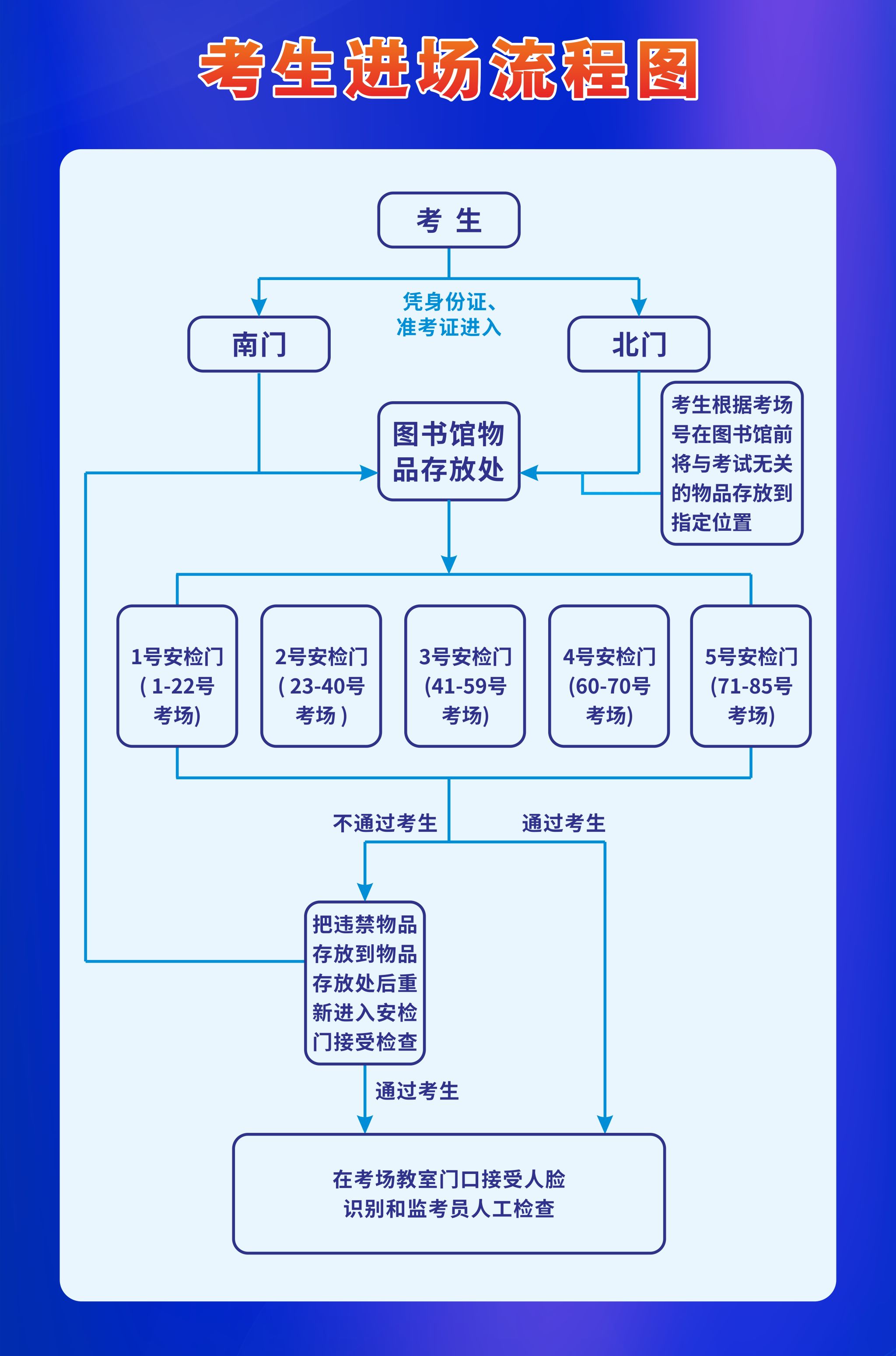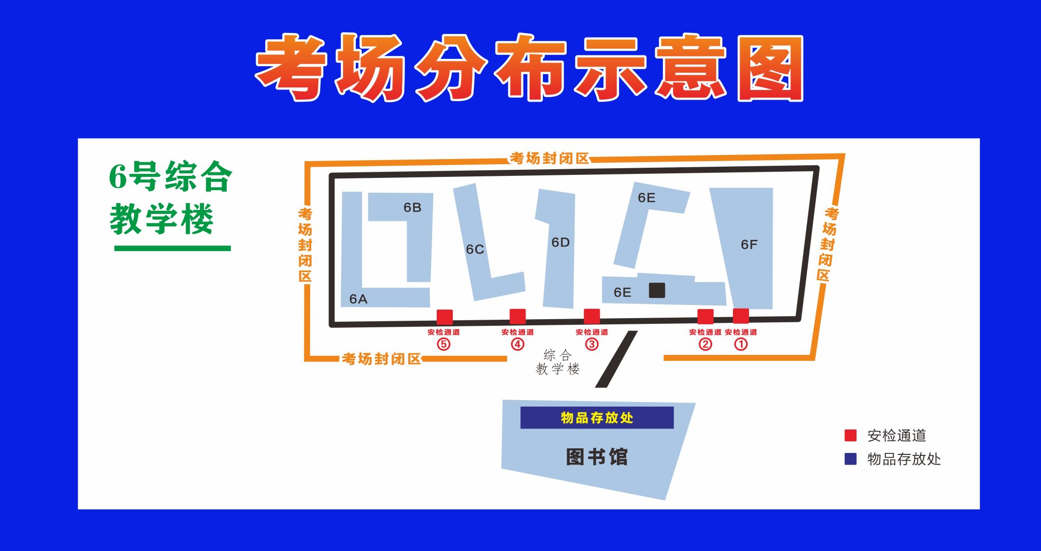 按照要求,我校考点在6号综合学楼设置考场封闭区,并在各入口处设置安检口,请务必注意以下要求: