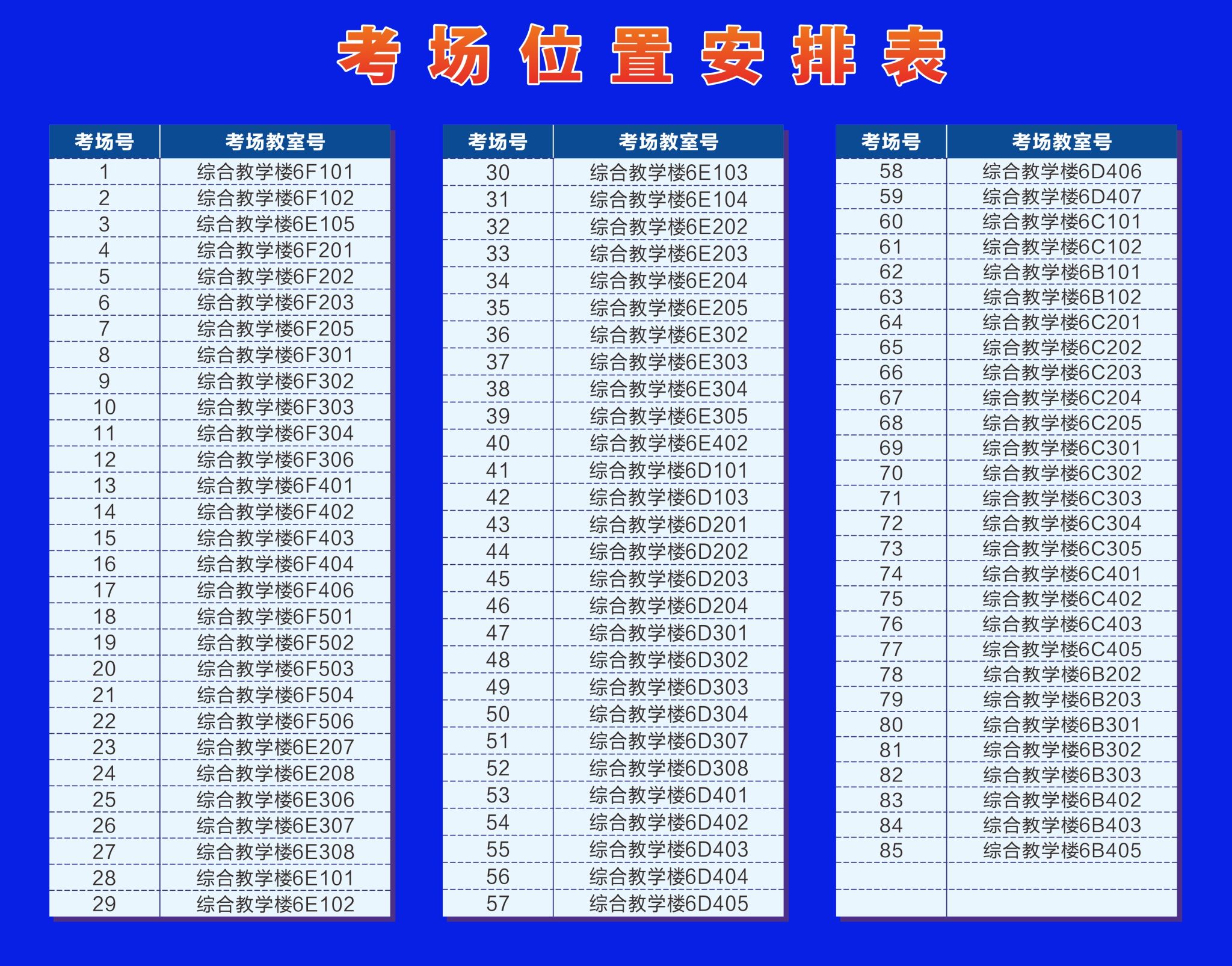 (松山湖校区)。考场安排在综合教学楼6号楼6B-6F栋。具体考场安排表及考场分布示意图详见如下图所示。