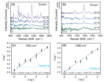 本工作以食用油中为例,提出一种基于高灵敏光纤SERS探针的非挥发性液相体系的快速、高灵敏检测新方案。团队利用具有自主知识产权的激光诱导蒸发自组装法,在光纤端面成功制备出金纳米棒团簇结构(图一),极大提高SERS检测灵敏度,其对R6G的检测灵敏度达到10-10 M。利用该类SERS探针,实现非挥发性液相体系——食用油中非法添加剂苏丹红和农药残留福美双的快速、高灵敏度检测,其对苏丹红和福美双的检测限(LOD)分别为2.4 × 10−6 mol/L和3.6 × 10−7 mol/L;且拉曼峰强与待测物浓度间存在良好的双对数线性关系(图二)。进一步地,回收率实验也证实了该基于光纤SERS探针的油相原位检测方法具有良好的定量检测能力。本工作为非挥发性液相体系的高灵敏度SERS光谱检测提供一种新方法,在食品安全、生物医学等领域具有重要的应用前景。