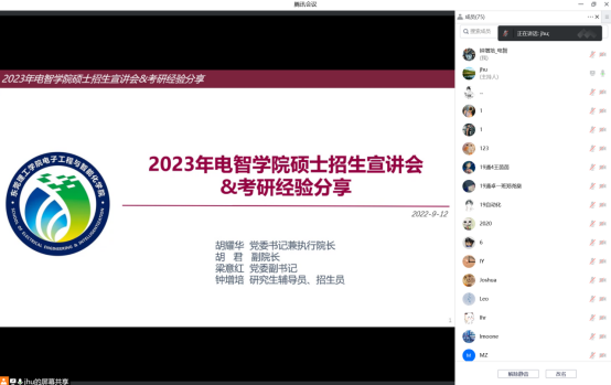 以线上、线下同步的形式顺利召开2023年硕士招生宣讲会暨考研经验分享会。会议由学院胡君副院长主持,党委书记兼执行院长胡耀华和钟增培博士出席本次会议,100余名有考研意向的2019级学生参加了此次会议。