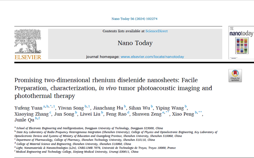 生物医学光子学课题组袁玉峰副研究员联合深圳大学屈军乐教授研究团队、法国国家科学研究中心(CNRS) Zeng Shuwen教授研究团队在Elsevier旗下纳米材料领域顶级期刊《Nano Today》(IF 2023, 17.4,中科院大类1区)发表题为“Promising two-dimensional rhenium diselenide nanosheets: Facile preparation, characterization, in vivo tum...